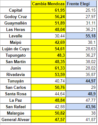 En los únicos municipios donde el Frente Elegí venció en esa categoría fueron en Lavalle, Tunuyán, Santa Rosa y San Rafael. En este último, el margen fue de apenas 0,7 puntos.