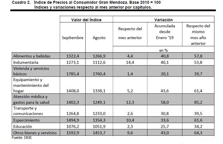 Impulsada por los aumentos en los rubros Indumentaria, Atención para la Salud y Esparcimiento, la inflación de septiembre en nuestra provincia fue de 5,6%, según informó la Dirección de Estadísticas e Investigaciones Económicas (DEIE).