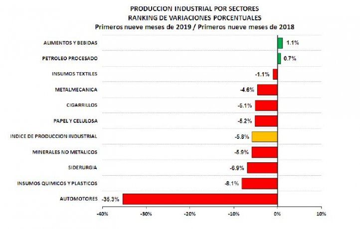 Por otro lado, la producción automotriz registró un nuevo retroceso interanual -aunque de menor magnitud que en meses anteriores- al que se sumó la caída de minerales no metálicos, metalmecánica y químicos y plásticos.