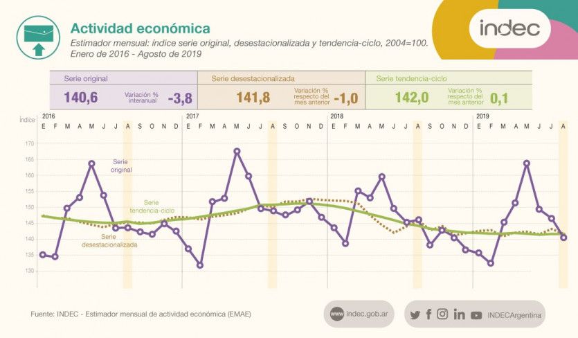 Las cifras del Estimador Mensual de Actividad Económica (EMAE) registra en agosto, respecto de julio, una baja del 1%.