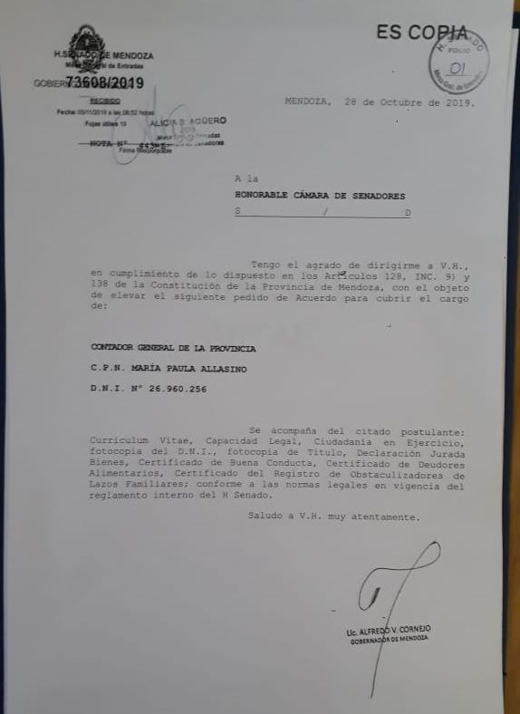 Allasino asumió como titular de la cartera de Hacienda julio de 2018 y en las elecciones de este año fue electa diputada provincial por Cambia Mendoza. Si resulta designada como contadora general deberá renunciar a su banca, la cual será ocupada por el tunuyanino Emiliano Campos.