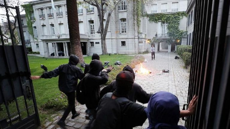 Un grupo de manifestantes atacó ayer la embajada de Argentina en Chile, ubicada a pocos metros de la céntrica Plaza Italia, donde se realizaba una masiva concentración de cierre de la huelga general convocada en el país contra el presidente Sebastián Piñera.