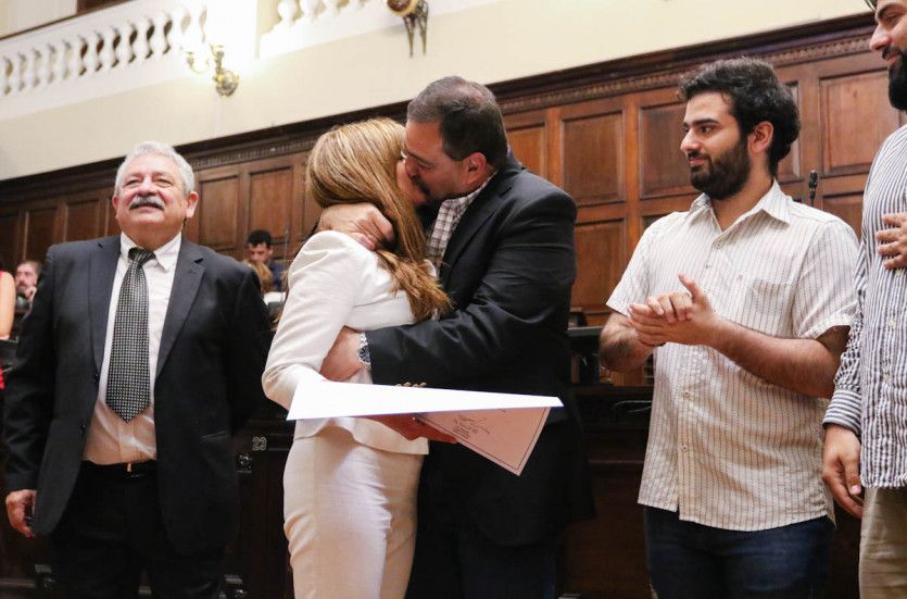 "Por Evita, por Cristina y por todos mis compañeros" fue la frase de Verónica Valverde, pareja del ex vicegobernador Carlos Ciurca, quien le dio un apasionado beso tras obtener el pergamino.