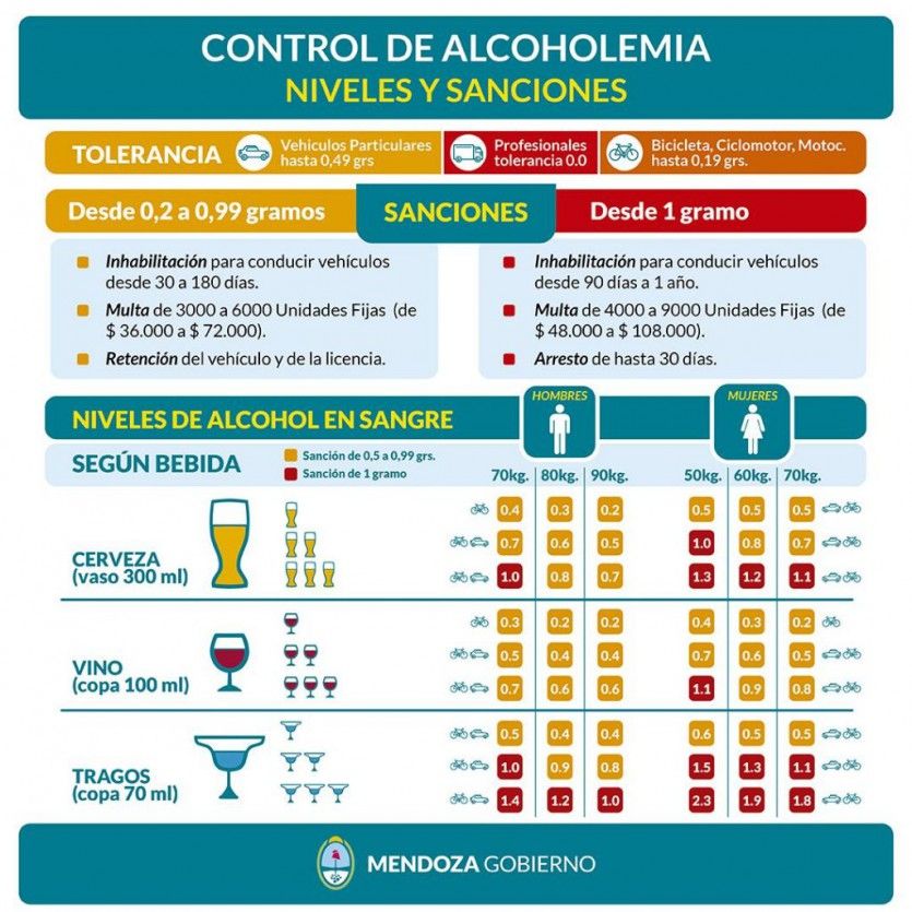 Por otro lado, con más de 1 gramo de alcohol en sangre, la falta pasa a la órbita contravencional y establece multa de 4 mil a 9 mil Unidades Fijas (de 48 mil pesos a 108 mil pesos), inhabilitación para conducir vehículos desde 90 a 365 días, retención del rodado y arresto de hasta 30 días.