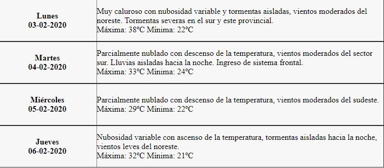 Así, el pronóstico para la jornada de hoy es: muy caluroso con nubosidad variable y tormentas aisladas, vientos moderados del noreste. Tormentas severas en el sur y este provincial. La máxima será de 38ºC y la mínima, de 22ºC.