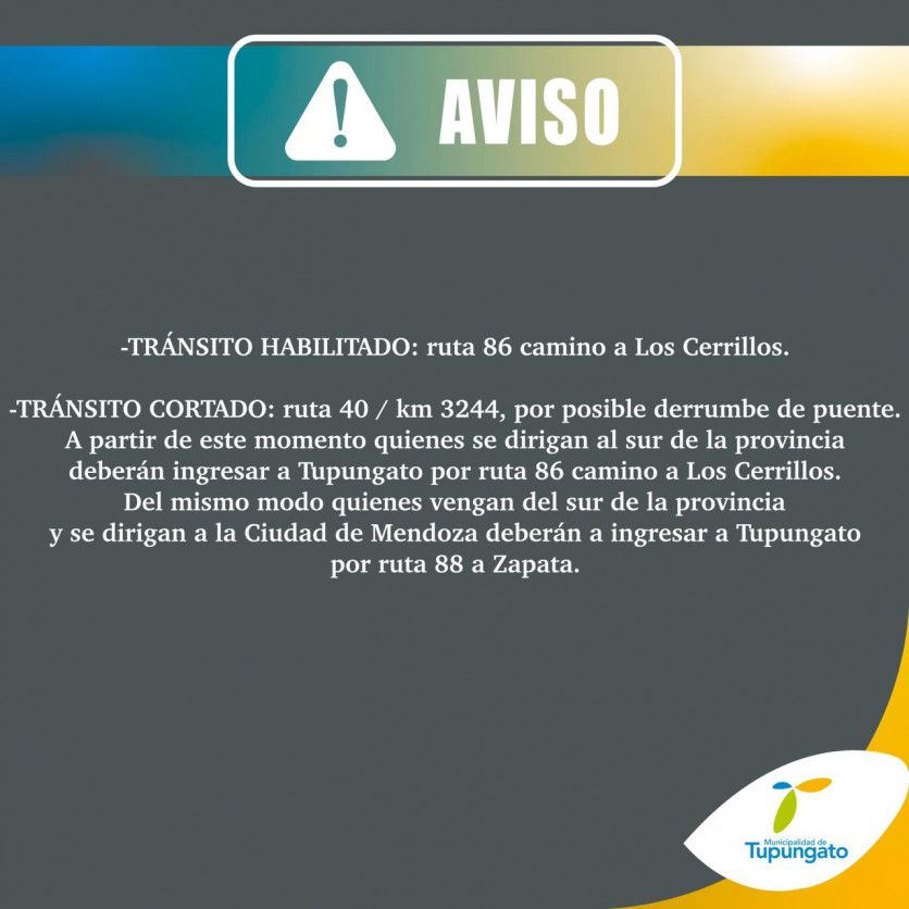 De esta manera, solicitaron que, quienes se dirijan al sur, deberán ingresar a Tupungato por la ruta 86, camino a Los Cerrillos. Por su parte, las personas que viajen hacia Ciudad de Mendoza deberán circular por ruta 88, en dirección a Zapata.
