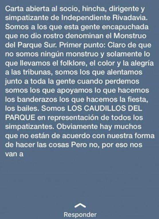 Uno de los cabecillas publicó en los estados de Whatsapp una "carta abierta al socio, hincha, dirigente y simpatizante de Independiente Rivadavia". En donde dicen que "somos a los que esta gente encapuchada que no dio el rostro denominan el Monstruo del Parque Sur".