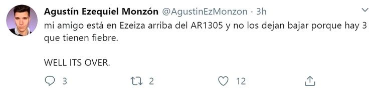 "Mi amigo está en Ezeiza arriba del AR1305 y no los dejan bajar porque hay 3 que tienen fiebre", contó Agustín Ezequiel Monzón en Twitter.