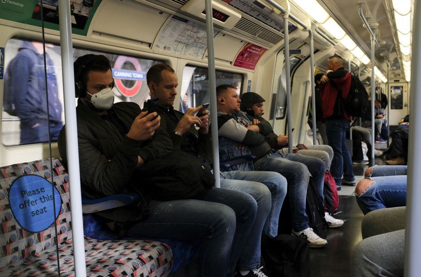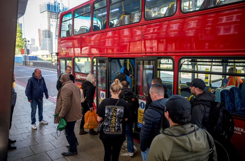 Pasajeros abordan un típico autobús de Londres. Muy pocos llevan alguna protección.