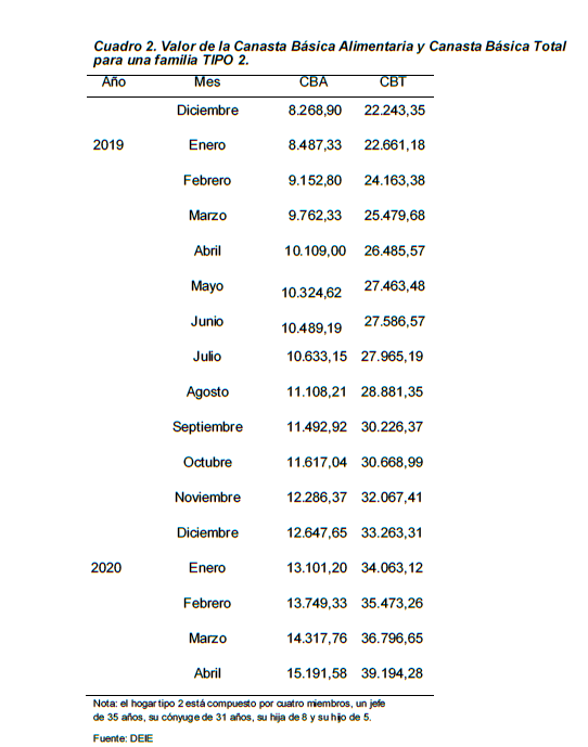 "Las canastas básicas alimentaria y total subieron 3,1% y 1,4%, respectivamente, en abril de 2020", indicó el Indec. Esa fue la variación respecto a marzo, mientras que la diferencia con el mismo mes del año pasado fue de 51,1% y 44,4%, respectivamente.