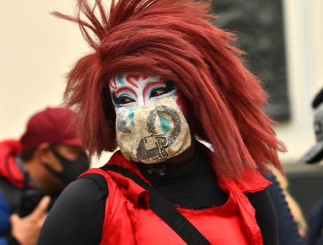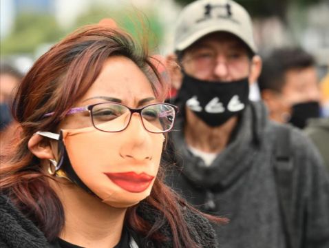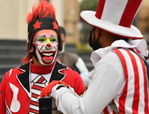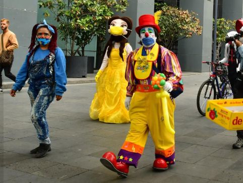 Sonrisa de payaso. Un artista callejero, protegido con una mascarilla que imita una sonrisa de payaso, durante una marcha para pedir apoyo económico, por la crisis del coronavirus, en Ciudad de México.