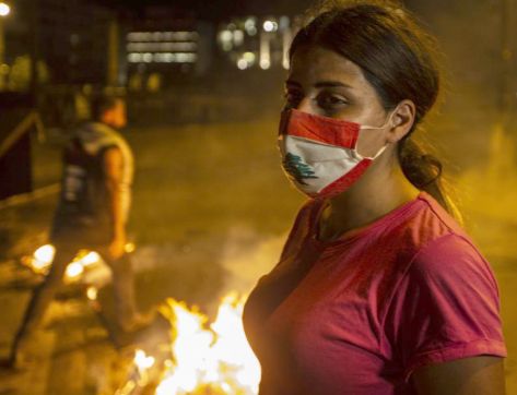 Con la bandera de Líbano. Una joven se protege con una mascarilla decorada con la bandera del Líbano, durante una protesta contra el Gobierno en Beirut.