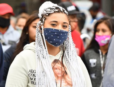 Imitando la cara. Una joven, protege su cara con una mascarilla que imita el rostro, durante una manifestación de comerciantes en el centro de Ciudad de México.