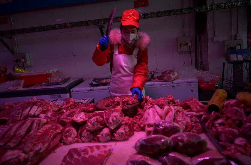Un empleado corta carne de cerdo en el mercado Xinfadi, donde en los últimos días se produjo un rebrote de coronavirus. El lugar fue cerrado temporalmente (Reuters)