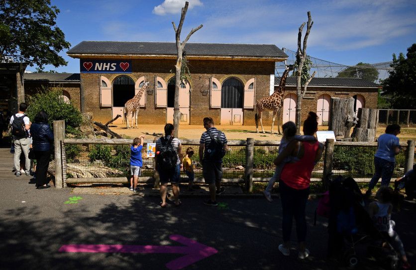 Visitantes observan las jirafas en el reabierto zoológico de Londres este lunes.