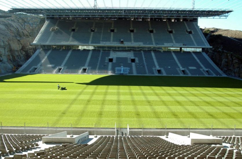 15-Estadio mnicipal de Braga (Portugal) No es el estadio de fútbol más antiguo, más grande o más caro, pero sin duda es uno de los más curiosos. Proyectado por el arquitecto portugués Eduardo Souto de Moura premio Pritzker de arquitectura en 2011), el estadio municipal de Braga solo tiene gradas en los laterales, el marcador está sobre una cantera que cierra uno de los fondos y las cubiertas de ambos graderíos están unidas por cables de acero que las sostienen sobre estos. scbraga.pt/estadio ANDREAS RENTZ GETTY