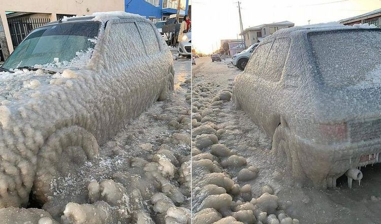 Tal como se puede apreciar en las imágenes que compartieron los usuarios en las redes sociales, un Peugeot 205 que había pasado toda la noche a la intemperie quedó cubierto de hielo en una ciudad que ofrece postales que se asemejan a una película.