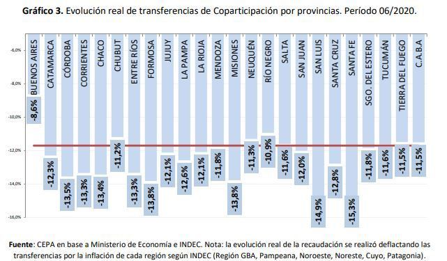 El Centro de Economía Política Argentina (CEPA) difundió un informe este miércoles, en el que advierte una reducción mensual de 14,2 puntos en la caída de los recursos que las provincias obtuvieron en junio por la Ley de Coparticipación.