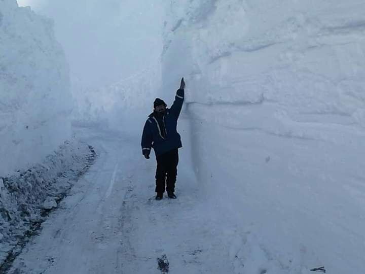 Tras la tormenta, una imagen se hizo viral: un trabajador de la zona se apostó frente a las paredes congeladas de la ruta para comparar alturas. La misma fue tomada por Jesús Jaque, maquinista del lugar.