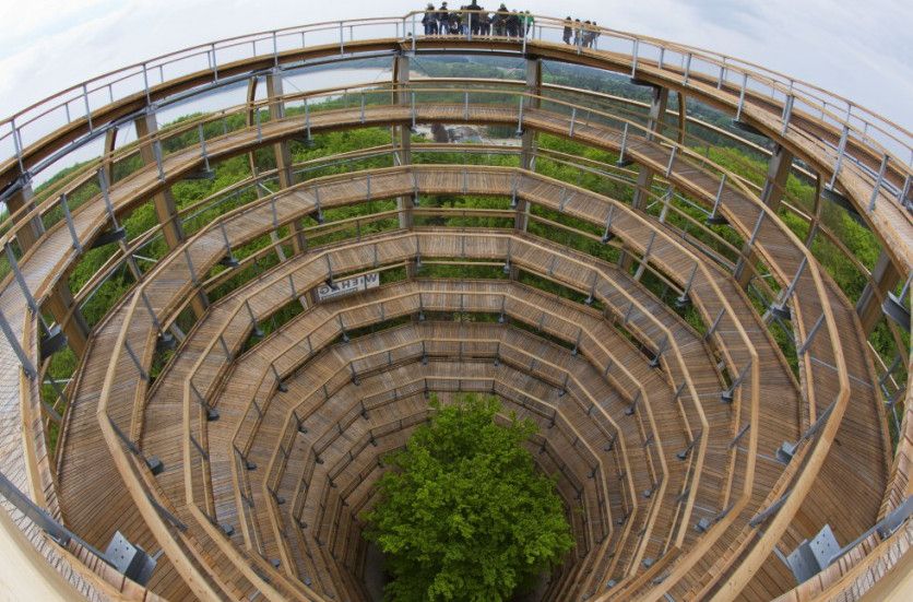 Baumwipfelpfad (Alemania) Un tobogán de 55 metros no lo ofrece cualquier bosque. Pero estábamos aquí por las vistas. Una rampa de subida en espiral lleva hasta una altura de 40 metros, para continuar a lo largo de 1,25 kilómetros en un recorrido por las copas de los árboles que acerca el bosque y los animales a los visitantes. JENS BUETTNER/DPA/AFP GETTY IMAGES