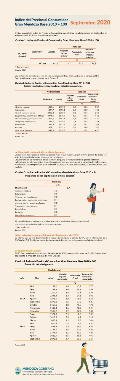 La inflación septiembre en la provincia fue del 2,7%, según vio reflejado hoy la Dirección de Estadísticas e Investigaciones Económicas (DEIE) de Mendoza. A nivel nacional el crecimiento fue de 2,8%.