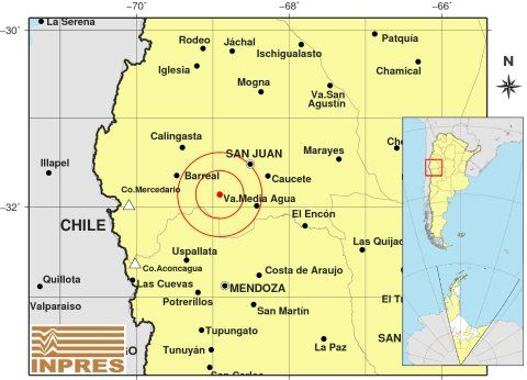 El epicentro ocurrió a 48 kilómetros al sudoeste de la capital, a 48 kilómetros al oeste de Media Agua y a 112 kilómetros de Mendoza.