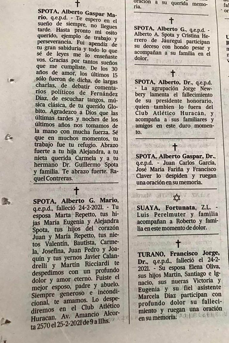 Lo cierto es que, por su estado de salud delicado, la partida de Spota era una posibilidad. Lo que no estaba en los planes de nadie fue lo que sucedió, un día después, en los avisos fúnebres que le dedicaron familiares y amigos y que se publicaron en el diario La Nación.