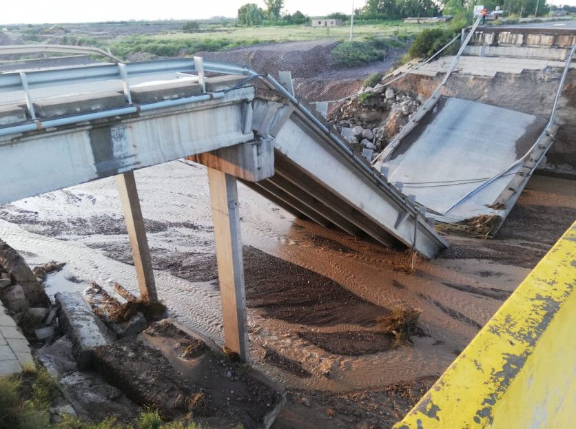 Se trata del puente de la mano sur a norte de la ruta que pasa sobre el Arroyo Los Pozos y que colapsó por completo a raíz de las intensas lluvias y crecidas que se produjeron esta madrugada.