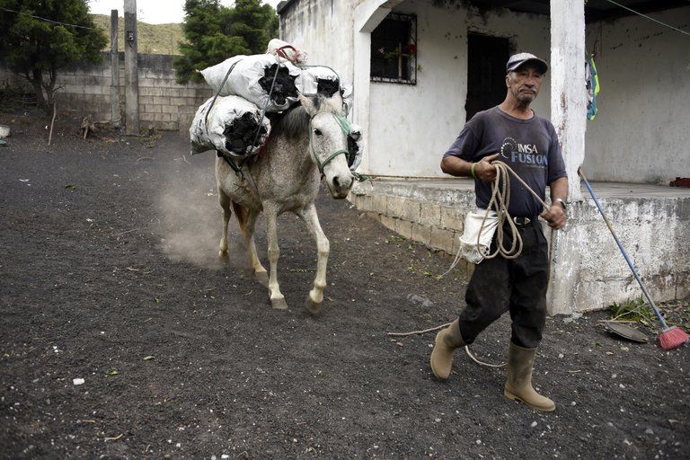 Un hombre y su caballo caminan en una calle llena de cenizas en Patrocinio (Orlando ESTRADA / AFP)