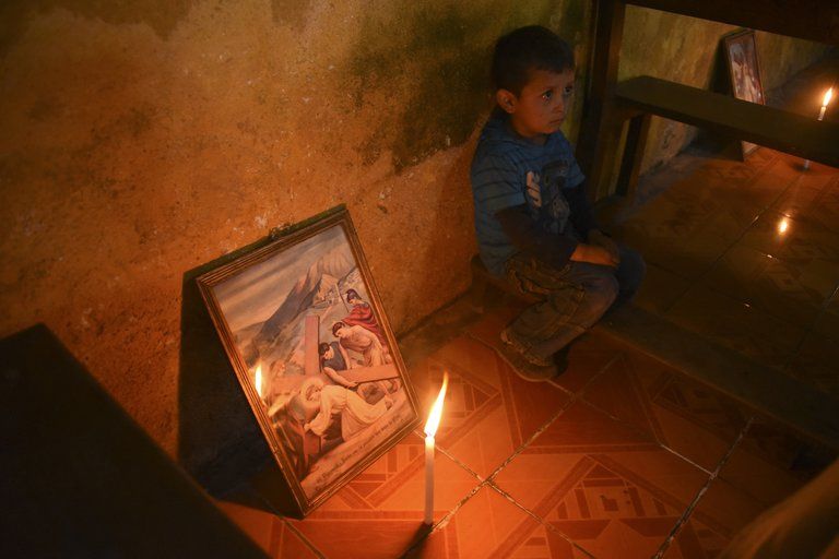 Un niño toma parte en el Via Crucis en el pueblo de Patrocinio (Orlando ESTRADA / AFP)