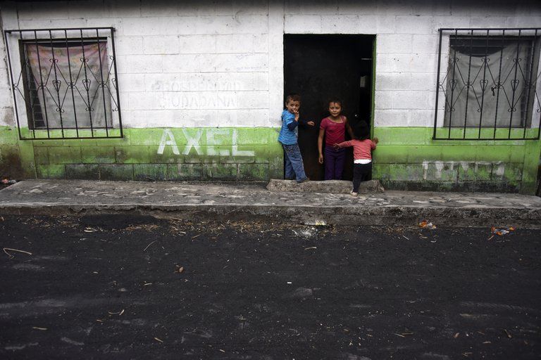 Niños afuera de su casa tras la erupción del volcán Pacaya (Orlando ESTRADA / AFP)