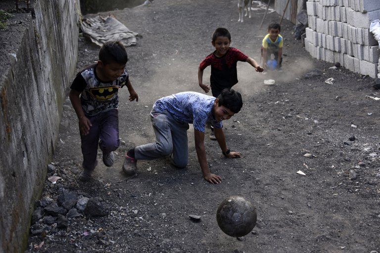 Niños juegan en una calle cubierta de cenizas en Patrocinio (Orlando ESTRADA / AFP)