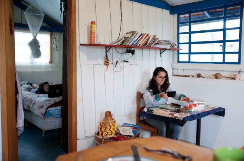 Bárbara, de 14 años, y su madre, Stella Prado, de 28, durante la cuarentena en su casa en Curitiba, una ciudad en el sur de Brasil. Bárbara vive con sus abuelos en el interior de São Paulo desde que su madre se mudó para estudiar y trabajar hace cinco años. Stella Prado la tuvo muy joven, con 14, la misma edad que tiene su hija hoy. El padre de Bárbara está ausente desde hace mucho tiempo y la familia de Prado es la única que apoya el crecimiento e independencia de las dos. ISABELLA LANAVE