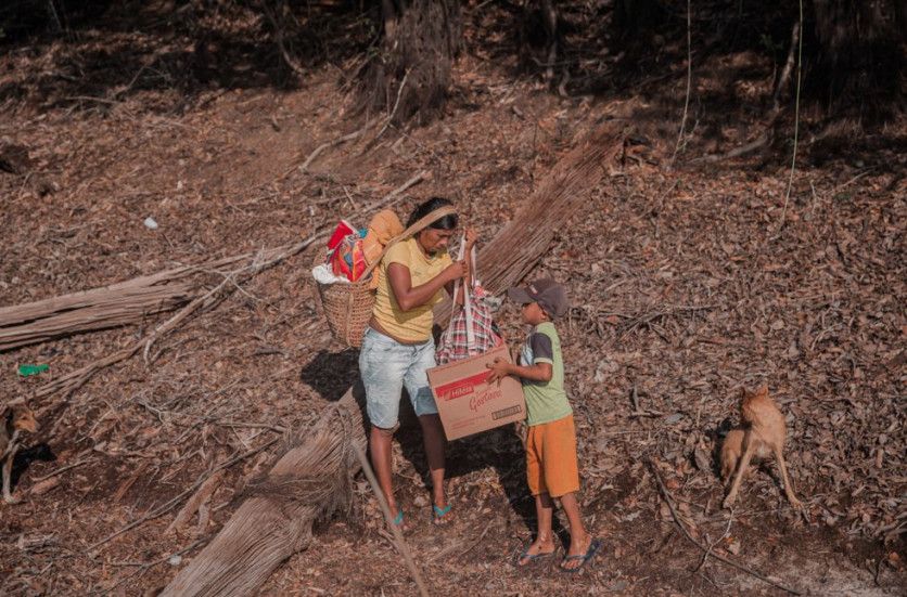 Marilucia Marcilina Batista, de 37 años, y su hijo menor, José, de ocho, se preparan para ir de su aldea hasta la casa de harina en el medio del bosque de la Tierra Indígena Andirá Marau, en el estado de Amazonas, Brasil, donde trabajará durante una semana. Con las escuelas cerradas, sus hijos le empezaron a ayudar más en la actividad de cultivo que les sostiene. Durante la pandemia ella no pudo viajar de la aldea a la ciudad para vender sus productos ni para recoger los recursos de los beneficios sociales que recibe del Gobierno y que usa para comprar los alimentos básicos para su familia. TAYNÁ SATERÉ