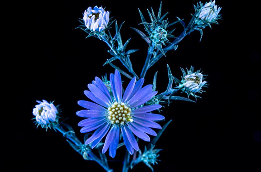 Una imagen UVIVF (fluorescencia visible inducida por ultravioleta) de una flor de margarita de flores silvestres.
