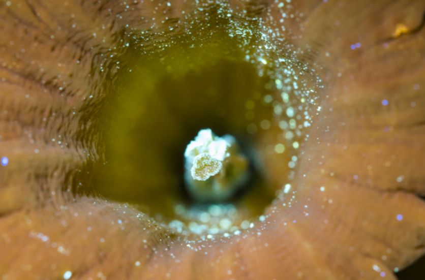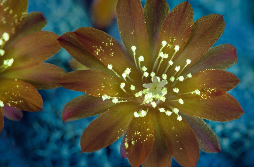 Una imagen UVIVF (fluorescencia visible inducida por ultravioleta) de una flor de cactácea.
