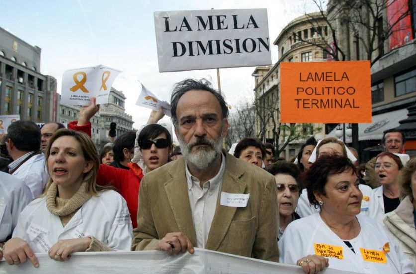 El doctor Luis Montes, fue presidente de la asociación Derecho a Morir Dignamente (DMD), acusado y posteriormente absuelto, en 2007, de ayudar a morir a 400 enfermos del hospital Severo Ochoa de Leganés (Madrid). Montes abanderó durante años la lucha por el derecho a una muerte digna. En la imagen, el médico en una manifestación para pedir el cese del entonces consejero de Sanidad de la Comunidad de Madrid, Manuel Lamela. RICARDO GUTIÉRREZ