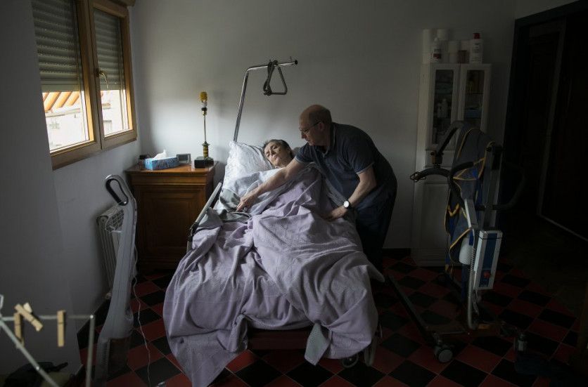El caso de Ángel Hernández y María José Carrasco fue también muy mediático. Ambos estuvieron esperando años a que hubiese una ley que les amparase y poder acceder al suicidio asistido legalmente. María José confesó en una entrevista a este diario: "No quiero dormirme, lo que quiero es morirme". En esta imagen, de octubre de 2018, Ángel cuida de su esposa, enferma de esclerosis múltiple en su casa de Madrid.