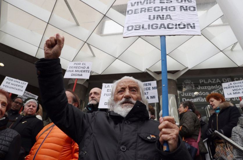 Un momento de la concentración frente a los juzgados de Plaza de Castilla de Madrid convocada por la asociación Derecho a Morir Dignamente en apoyo a Ángel Hernández, al día siguiente de que este ayudara a morir a su esposa, María José Carrasco.