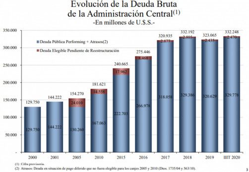 Al cerrar 2015 cuando Cristina Fernández de Kirchner abandonó el Gobierno la Deuda Bruta de la Administración Central era de 240 mil millones de dólares. En diciembre de 2019, cuando Mauricio Macri dejó el Ejecutivo, la deuda ascendía a 323 mil millones de dólares (redondeamos números en todos los casos para simplificar la lectura), o sea 83 mil millones de dólares más.