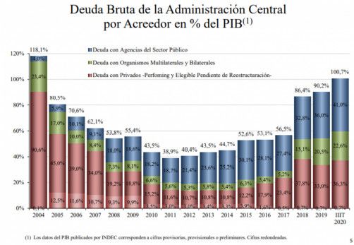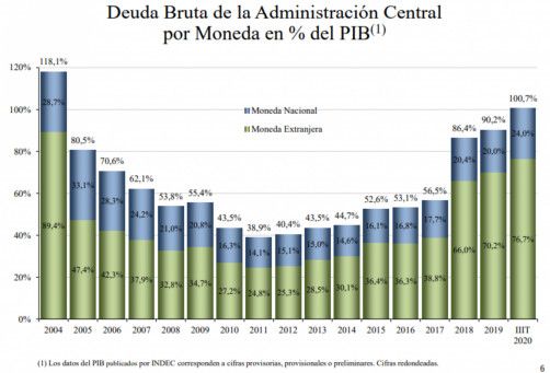 Al finalizar la gestión del macrismo la deuda nominada en moneda extranjera equivalía al 70% del PBI y la nominada en moneda nacional al 20.