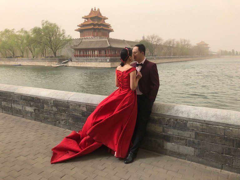 Una pareja recién casada posa para un foto frente a la Ciudad Prohibida de Beijing. (AP/Sam McNeill)