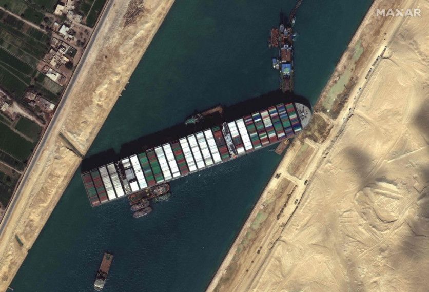 Una Imágen satélite publicada por Maxar Technologies muestra los trabajos de los remolcadores, este sábado. El 'Ever Given', uno de los buques portacontenedores más grandes del mundo y propiedad de la naviera Evergreen, permanece desde el miércoles encallado en el estratégico canal de Suez, la vía navegable que conecta el mar Rojo con el Mediterráneo, bloqueando la circulación en ambas direcciones y provocando un gran atasco en una de las principales arterias para el transporte marítimo mundial. AFP