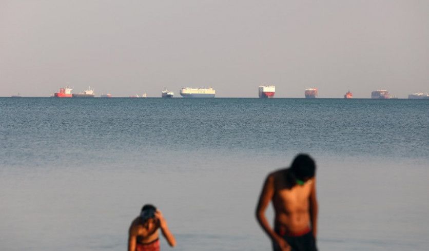 Gran cantidad de barcos esperan en la entrada del canal de Suez, cerca de la ciudad de Ismailía. La aseguradora alemana Allianz publicó el viernes un informe sobre la situación en el canal de Suez, en el que cifraba las pérdidas semanales para el comercio mundial entre los 6.000 y los 10.000 millones de dólares (entre 5.090 y 8.485 millones de euros). KHALED ELFIQI EFE