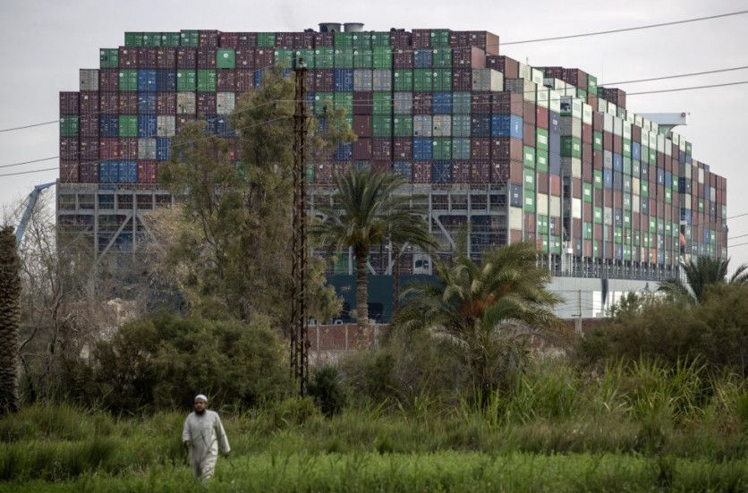 Contenedores del 'Ever Given' vistos desde una población cercana al canal de Suez, este domingo. El 'Ever Given', de 400 metros de eslora, 59 de manga y un tonelaje de 224.000 toneladas, según el comunicado de la Autoridad del Canal de Suez, se encuentra entre los buques portacontenedores más grandes del mundo. MAHMOUD KHALED GETTY IMAGES
