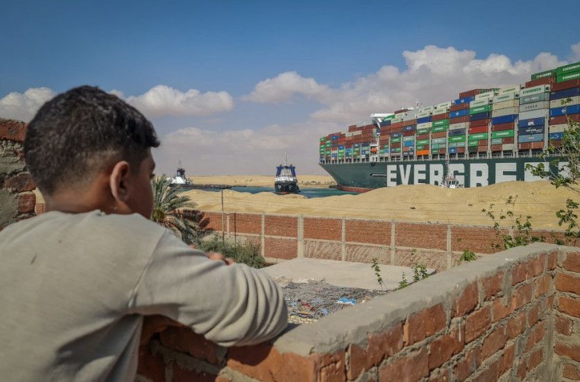 Un niño observa el buque desde una población cercana al canal de Suez, este jueves. Royal Boskalis Westminster, la empresa a quienes los propietarios del 'Ever Given' -la compañía japonesa Shoei Kisen Kaisha- han encargado el rescate de la nave, tan solo ha podido precisar que se necesitarán "varios días o incluso semanas" para liberar el canal. SAMUEL MOHSEN AP
