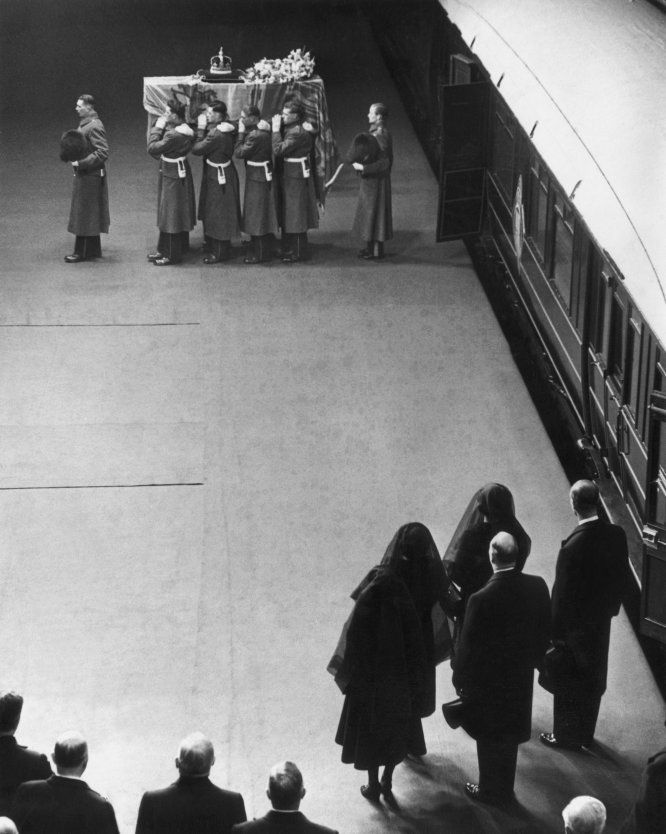 La muerte del Rey La noticia de la muerte de su padre, Jorge VI, el 6 de febrero de 1952, coge a Isabel y Felipe de viaje en Kenia. La ascensión al trono provoca una disputa familiar sobre el posible cambio de denominación de la casa real, para que Windsor se convirtiera en Mountbatten, según la costumbre de que la mujer tomase el apellido del marido. La propuesta contaba con la oposición del primer ministro Winston Churchill y la reina María, abuela de Isabel, quienes lograron imponer su criterio. Tras la muerte de ambos, la reina Isabel tomó la decisión de que los descendientes masculinos sin títulos reales tomaran el apellido Mountbatten-Windsor. En la imagen, el ataúd de Jorge VI es sacado del tren para ser llevado al funeral en Westminster, en presencia de sus hijas, su viuda y su yerno. GETTY IMAGES