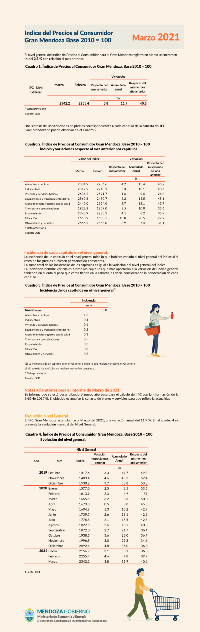 Con los gastos relativos a Educación, Alimentos y bebidas, y Esparcimiento el IPC (Índice de Precios al Consumidor) que mide la DEIE (Dirección de Estadísticas e Investigaciones Económicas) en Mendoza alcanzó en marzo el 3,8%