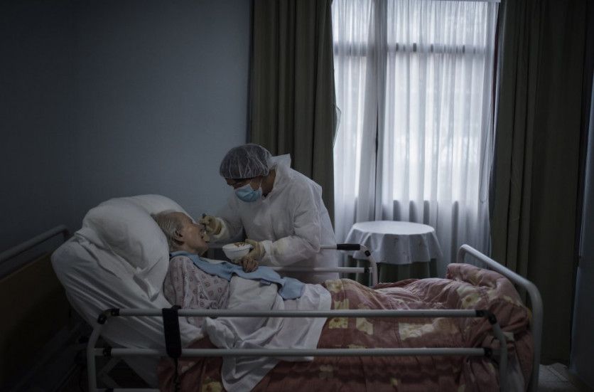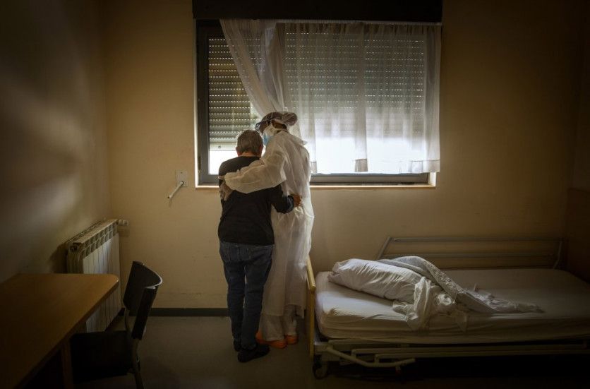 Una anciana y una trabajadora se abrazan en la habitación en la que la primera permanece confinada, en una residencia de la provincia de Barcelona, 29 de abril, 2020. Esta es una de las imágenes de Archivo Covid, una iniciativa de Palacios junto a otros fotógrafos. SANTI PALACIOS