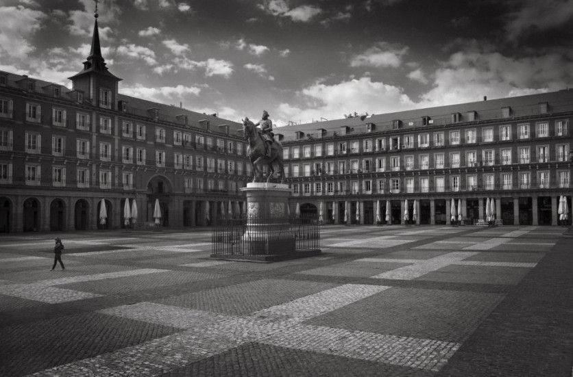 Una persona cruza la solitaria Plaza Mayor de Madrid el primer día del confinamiento. Las sombrillas recogidas son el único recuerdo de las bulliciosas terrazas. Madrid, 15 de marzo de 2020. Fotógrafos como Carmenchu Alemán se lanzaron a la calle aquellas semanas a pesar del riesgo de contagio y el desconocimiento de cómo actuaba el virus. CARMENCHU ALEMÁN